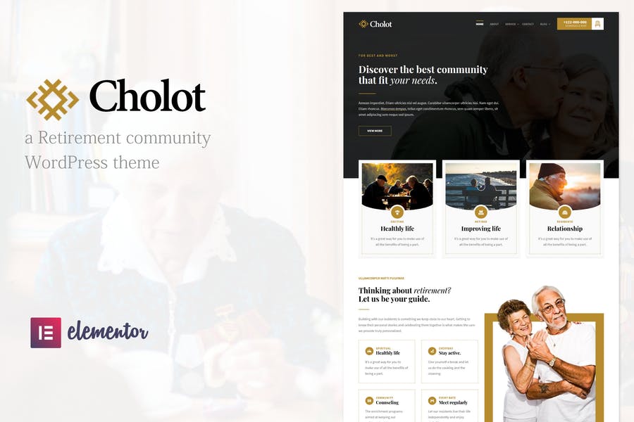 Cholot is a Responsive Retirement Community WordPress Theme with clean,bold,modern and elegant design. It can be used for community or company to selling their services. It come with drag/drop page-builder to creating the page/website in the easiest way.