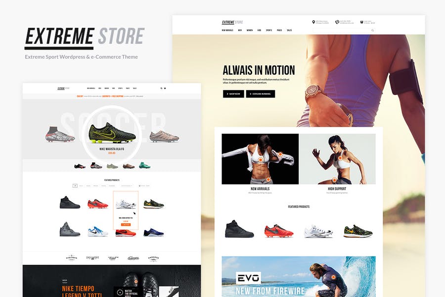 Extreme Store is a modern, responsive alluring Sports Clothing & Equipment Shop WordPress Theme (Woocommerce) built for the contemporary online sports store and stylish sports retailer of sports clothing, attractive accessories, and equipment. Sports Clothing Store WordPress plugins Due to WooCommerce compatibility you can create a versatile and completely customizable sport shoes shop, footwear store firm, beautiful yoga shop, online sports storecompany. It is also great for sport blog, sport nutrition blog and blogs related to: running athlete, exercises, fitness and workout.